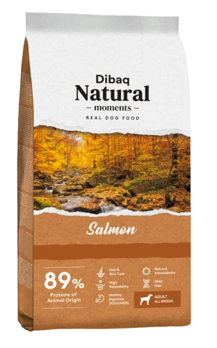 דיבאק סלמון לכלבים בוגרים, Dibaq salmon fish for adult dogs. מזון מלא המתאים במיוחד עבור כלבים מגזעיים בינוניים בעלי רמת פעילות גבוה. דיבק סלמון לכלבים בוגרים מכיל 21% אחוז דג סלמון. בנוסף מזון יבש דיבאק מכיל חומצות שומן אומגה 3 ואומגה 6 לטיפוח השיער והעור ואינולין פרוביוטי שעוזר לאיזון המעיים ורכיבים טבעיים המסייעים לשיפור הבריאות הפיזית של הכלב. משקל אריזה: 15 ק"ג.