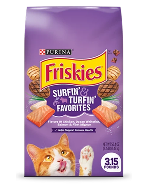 תירס טחון, חליטת אורז , קמח שיירי עוף,קמח חיטה , קמח כוספת סויה, קמח גלוטן תירס, שומן מן החי מוגן על ידי טוקופרולים מקור טבעי לויטמין E, קמח סויה, חלב , קמח דגי אוקיינוס, מצוי חלבון סויה,מצוי כבד , גלוטן חיטה, קלציום קרבונאט, חומצה פוספורית, מלח, כולין כלוריד,אשלגן כלוריד, צבעי מאכל (אדום 40, צהוב 5 ,כחול 2 ואחרים),קמח בשר ועצמות, כבד, קלציופ פוספאט, טאורין, אבץ סולפאט, ברזל סולפאט, ויטמין E, ניאצין, מנגן סולפאט, ויטמין A, קלציום פאנטוטנאט, תיאמין, נחושת, ריבופלאבין,ויטמין B12 , פירידוקסין, חומצה פולית, ויטמין D3 , קלציום יודאט, ביוטין, קומפלקס מנדיון סודיום ביסולפיט(מקור לפעילות ויטמין K1), סלניום.