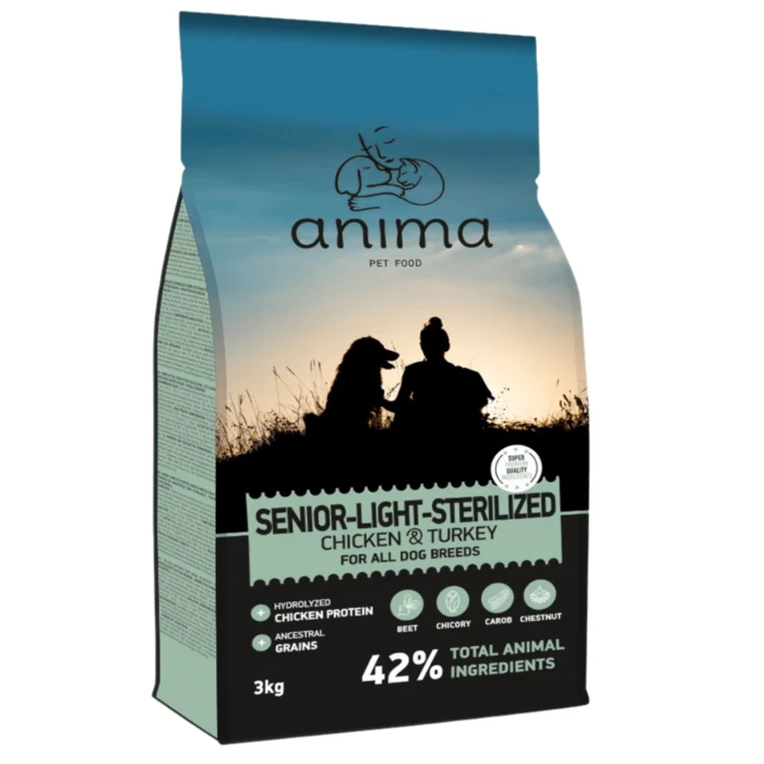 מתכון העוף וההודו של Anima מסדרת Senior, Light, Sterilized פותח במיוחד עבור כלבים מבוגרים, מסורסים או בעלי נטייה לעודף משקל מכל הגזעים.