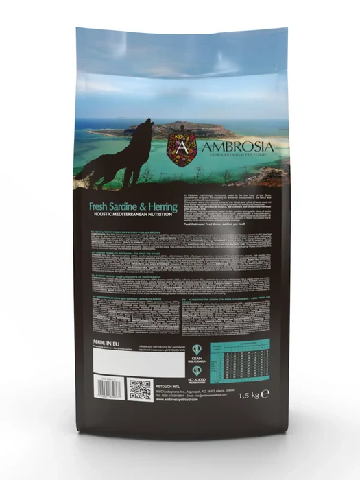 מתכון הסרדינים וההרינג הטריים של Ambrosia משלב חלבון מדגים שקל לעיכול – המגיע מפילטים טריים של סרדין יחד עם דג הרינג עשיר בחלבון.
