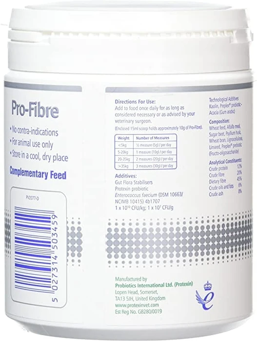 Pro-Fibre של Protexin הוא תוסף תזונתי איכותי המיועד לכלבים וחתולים, לשמירה על מערכת עיכול מאוזנת ובריאה. הפורמולה משלבת פרוביוטיקה פעילה עם סיבים מסיסים ובלתי מסיסים, המסייעים לעיכול תקין, שיפור יציאות והפחתת בעיות במערכת העיכול.